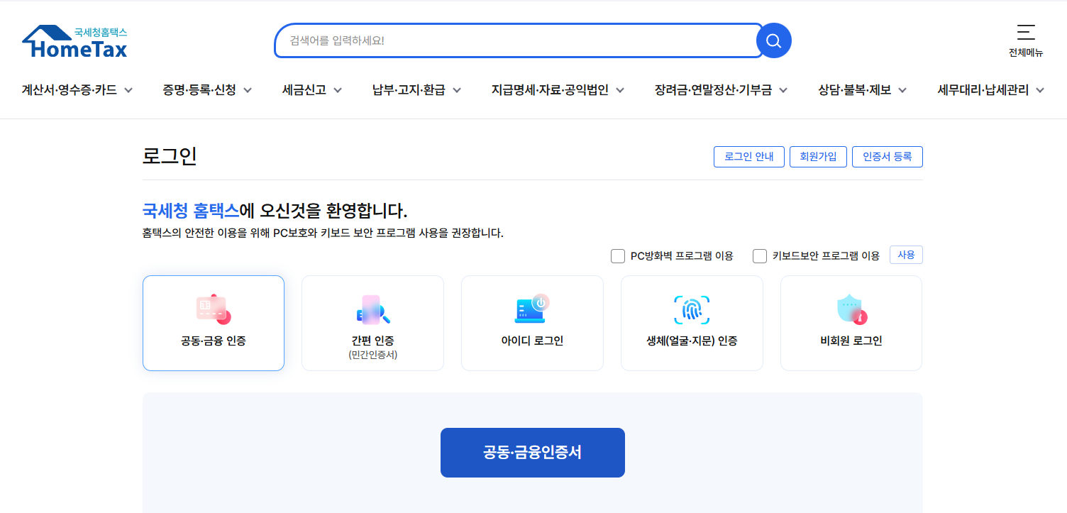 - 준비물: 공동인증서 (사업자용), 사업자등록번호, 거래 내역 정보