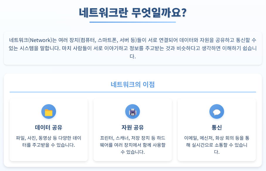 네트워크(Network)는 여러 장치(컴퓨터, 스마트폰, 서버 등)들이 서로 연결되어 데이터와 자원을 공유하고 통신할 수 있는 시스템을 말합니다. 마치 사람들이 서로 이야기하고 정보를 주고받는 것과 비슷하다고 생각하면 이해하기 쉽습니다.